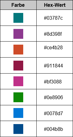 - Über den Hex-Wert neben dem Miniaturbild können Sie noch die Hintergrundfarbe der Überschrift und der Schaltflächen ändern und im Vorschaubild darunter überprüfen. In der folgenden Tabelle sehen Sie die Farben der Seitenleiste Design und deren Hex-Werten: