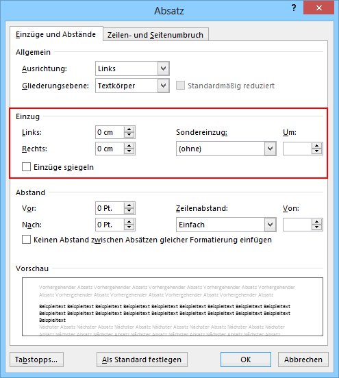 Wenn Sie im Bereich Einzug das Kontrollkästchen Einzüge spiegeln aktivieren, ändern sich die Bezeichnungen Rechts und Links in Innen und Außen: