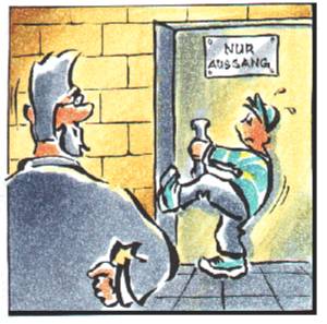 „Ja aber was soll das denn?“ empörte sich JOJO. Auf ihrem Rundgang waren sie an eine hohe Mauer gestoßen. „An der Tür steht ja ‚Nur Ausgang‘. Gib es denn dort keinen Eingang?“