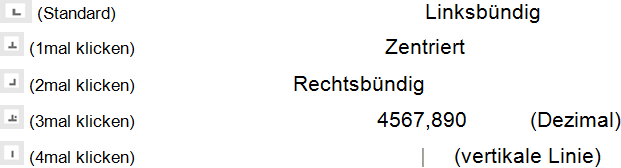 Am linken Rand des Lineals (entsprechendes Kontrollkästchen auf der Registerkarte Ansicht (Gruppe Anzeigen) aktivieren) sehen Sie ein Symbol für die Tabstopp-Ausrichtung oder für den Absatz-Einzug. Sie können eine andere Tabstopp-Ausrichtung oder einen anderen Absatz-Einzug im Lineal vor dem Setzen des Tabstopps auswählen, wenn Sie mit der Maus links vom Lineal auf das jeweilige Symbol 1- bis 6mal klicken. Es sind verschiedene Ausrichtungen verwendbar. Jeder nachfolgende Tabstopp ist bei der Position 7 cm gesetzt: