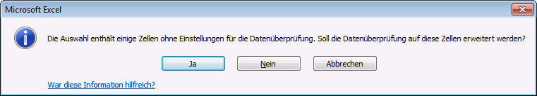 Wählen Sie erneut die Datenüberprüfung aus. Sie werden von Excel gefragt, ob Sie die Datenüberprüfung auf die neuen Zellen ausdehnen wollen: