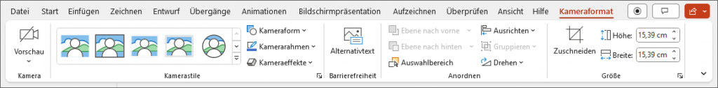 Sie können das Objekt wie gewohnt verschieben und über die Markierungspunkte in der Größe ändern. Außerdem stellt Ihnen PowerPoint die Kontext-Registerkarte Kameraformat zur weiteren Bearbeitung zur Verfügung: