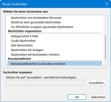 Wählen Sie im Dialogfeld Neuer Suchordner ganz unten in der Liste Benutzerdefinierten Suchordner erstellen aus und klicken Sie auf die Schaltfläche Auswählen.