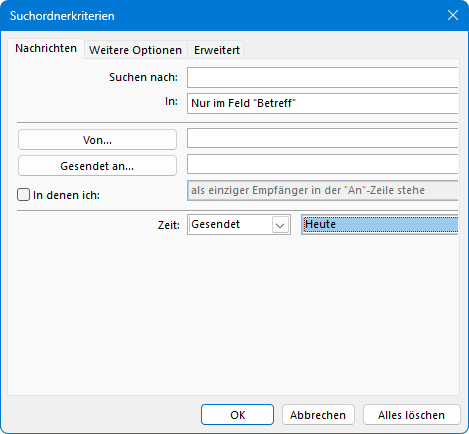 Das Dialogfeld Suchordnerkriterien wird geöffnet. Wählen Sie im Listenfeld Zeit den Eintrag Gesendet und im Feld dahinter Heute.